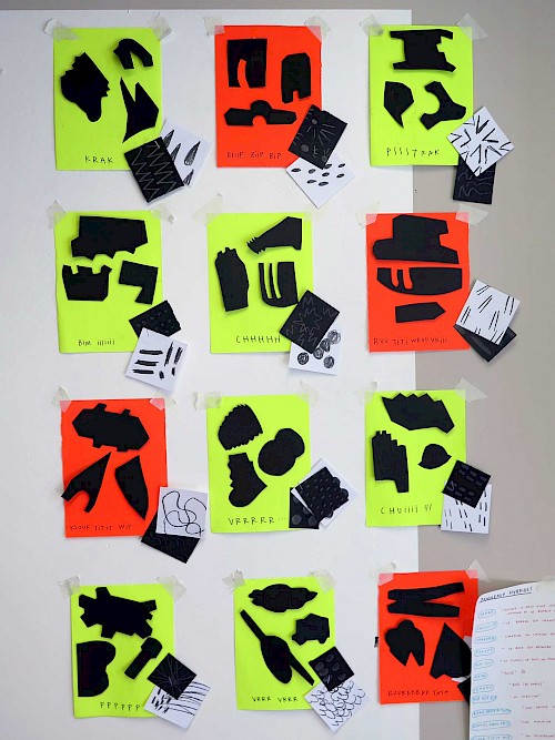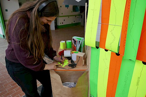 Durant les 8 mois d’interventions, et tout en proposant des formes d’ateliers différentes d’action en action, nous avons axé sur trois temps principaux : celui de la recherche croisant Histoire et imaginaire, celui de la stimulation créative à partir d’un relevé sensoriel, enfin celui de l’invention d’un mode de communication propre au chantier et à ses alentours.