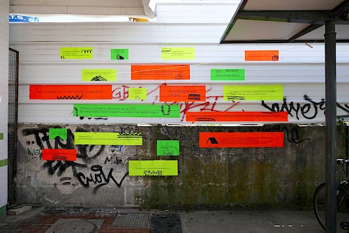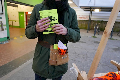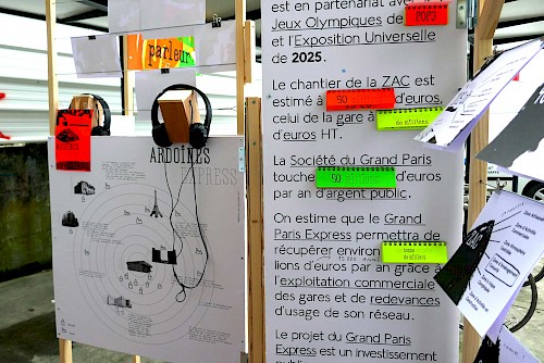 Le collectif Ne Rougissez Pas ! a proposé aux passants ponctuels ou aux usagers habitués de la gare et ses alentours de répondre à des questions absurdes, participer à des jeux, lancer des mots, des phrases, crier bas, chuchoter fort .Ils ont deviné, inventé et imaginé les bruits et les paroles du chantier des Ardoines.
