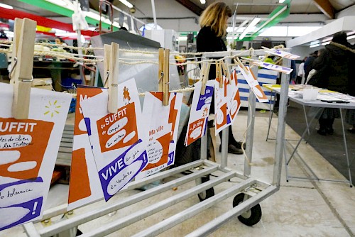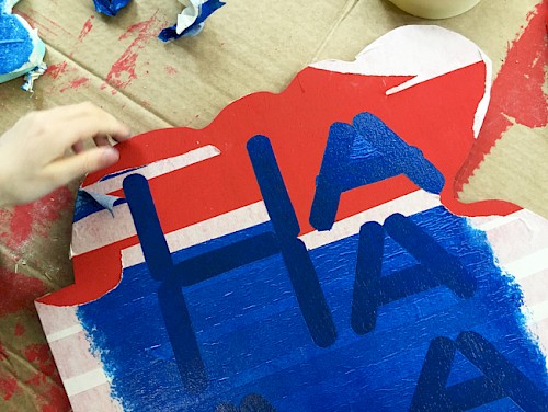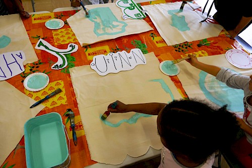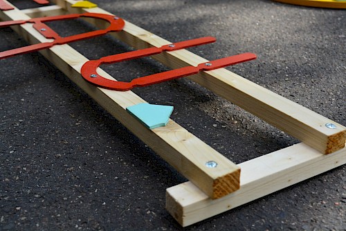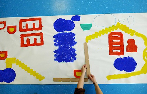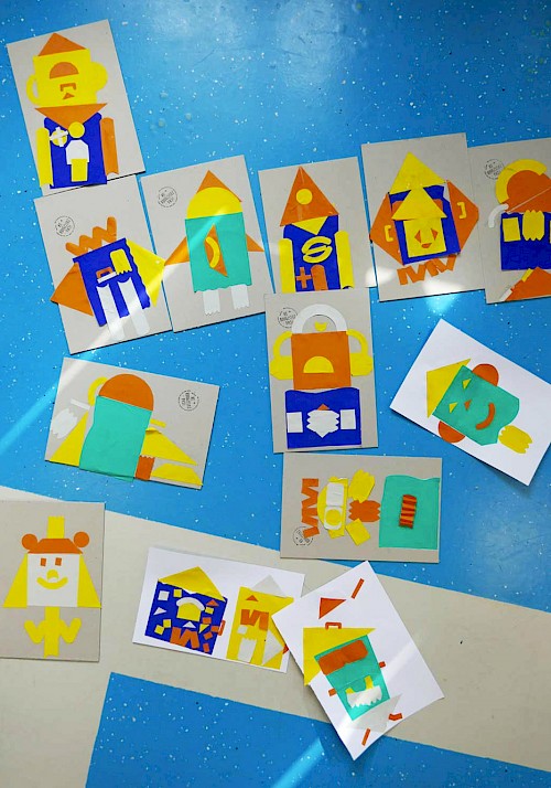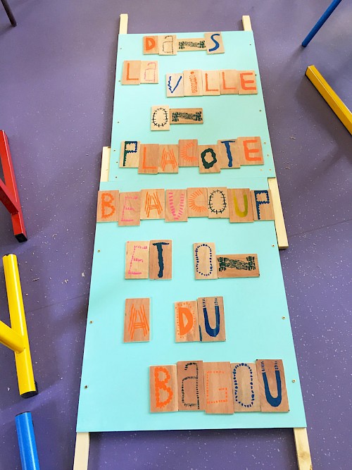 Les CP et CE1 de l’école Tailhan se sont mis à la scie à chantourner pour construire une nouvelle signalétique poétique qu’ils ont imaginé eux-même sur les grilles de leur école. Les CE2 de l’école Deloges ont pratiqué la typographie et la sérigraphie pour exposer leurs écrits d’une ville volubile dans la cours de récré. Au Centre de loisir Wallon et à la Maison de quartier Gérard Philipe, les enfants ont réalisé des drapeaux à scander des onomatopées dans les rues. Les Maternelles de l’école Morère ont imaginé une maquette de la ville de Palaiseau en retraçant les chemins et les cours d’eau, bâtissant les immeubles et le centre-ville et en proposant des maisons - farfelues. Les usagers du Parvis Multisport ont complété des tracts pour fait l’état des lieux du quartier Opéra à Massy. Un peu plus loin, le kiosque du quartier de la Villaine s’est vu habillé d’enseignes par les personnes du Centre social APMV afin de trouver un nom à cette place. L’ensemble de ces fabrications s’est découpé en de nombreux ateliers implicatifs dans une démarche de création artistique, éducative et citoyenne.