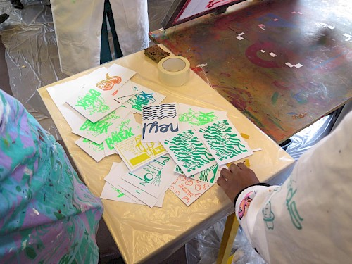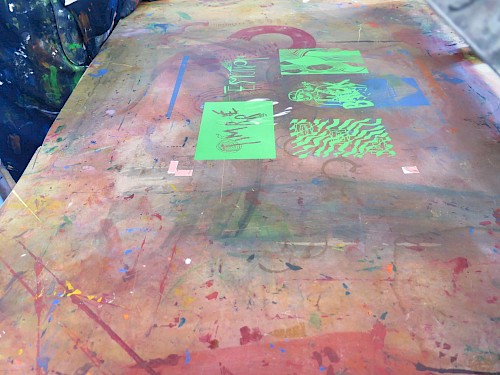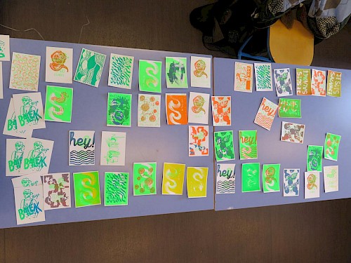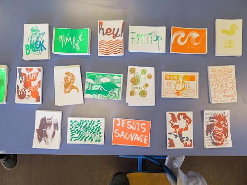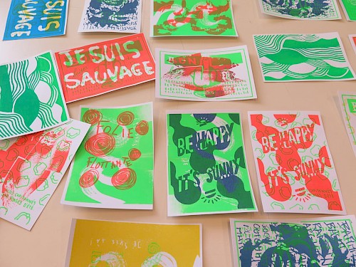 À travers des combinaisons de formes et de sens, les étudiants ont été sensibilisés au medium d’impression de la sérigraphie et de l’aléatoire. Ils ont été invités à détourner un médium dit sériel pour fabriquer des objets uniques par la combinaison et la superposition des couches et des couleurs.