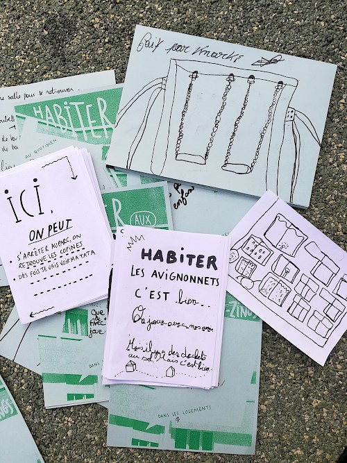 Cette création graphique met en images et en mots des bribes de témoignages, récits de vie, recettes, histoires et dessins. Ce journal est destiné à être lu, partagé et distribué chez les ami(e)s, voisin(e)s, commerçant(e)s et partout dans la ville.