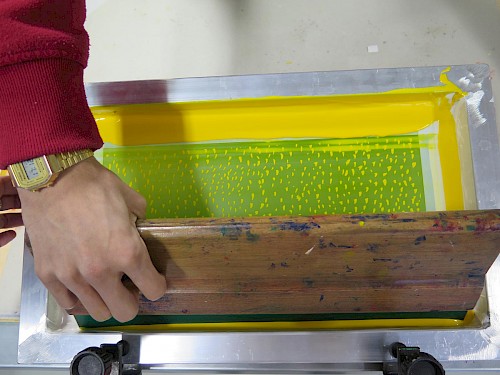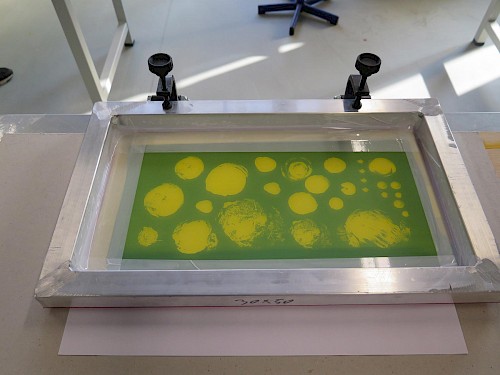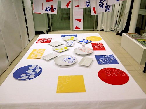 Avec des adjectifs relatifs aux goûts, aux repas, les élèves ont produit des recherches graphiques pour ensuite créer une disposition et une règle du jeu. Ils ont réfléchi sur ce thème quotidien, commun pour créer une cohérence graphique et visuelle entre le support, le motif et la scénographie. L’apprentissage de la sérigraphie sera ici expérimenté sur les différents supports afin de créer une cohérence graphique et sensible à l’ensemble du projet de l’étudiant.