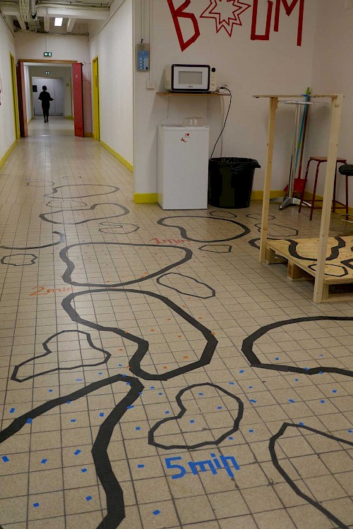Les étudiant.es ont apporté des ponctuations, des indices, des histoires dans l’école, avec comme intention de voir, de sentir, de s’arrêter ; pour vivre une autre expérience de ces passages.